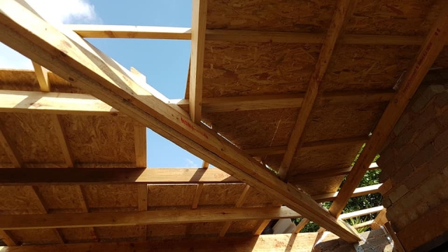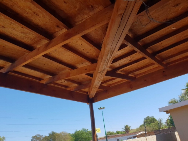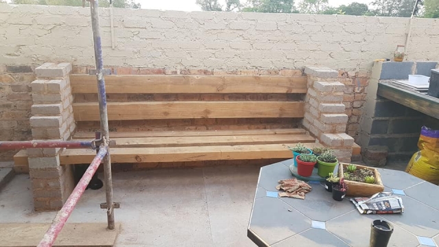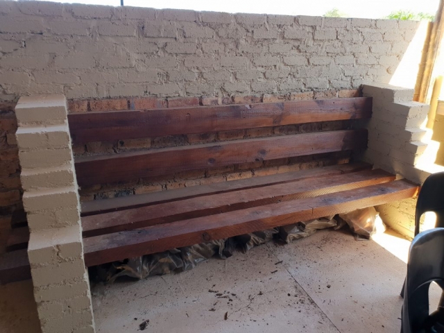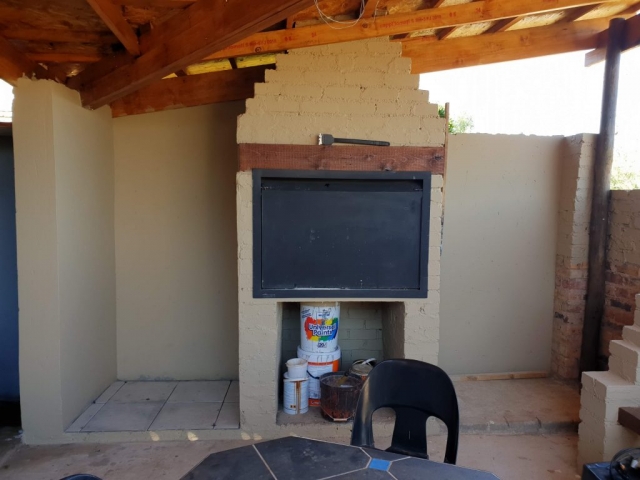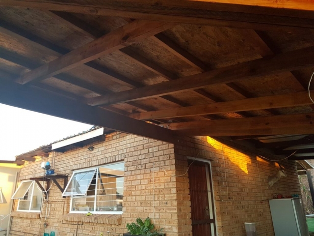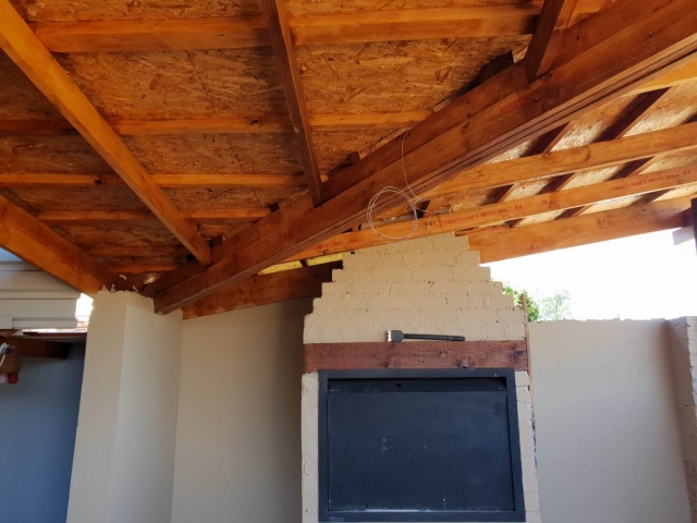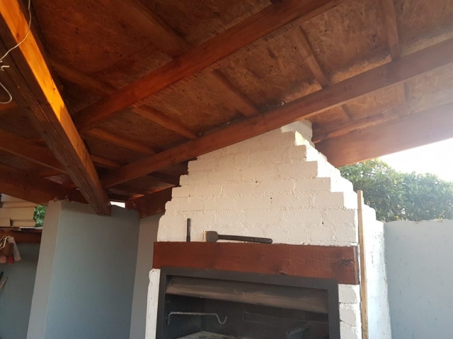 Braai area roof build with exposed ceilings, built in braai and custom built wooden bench.